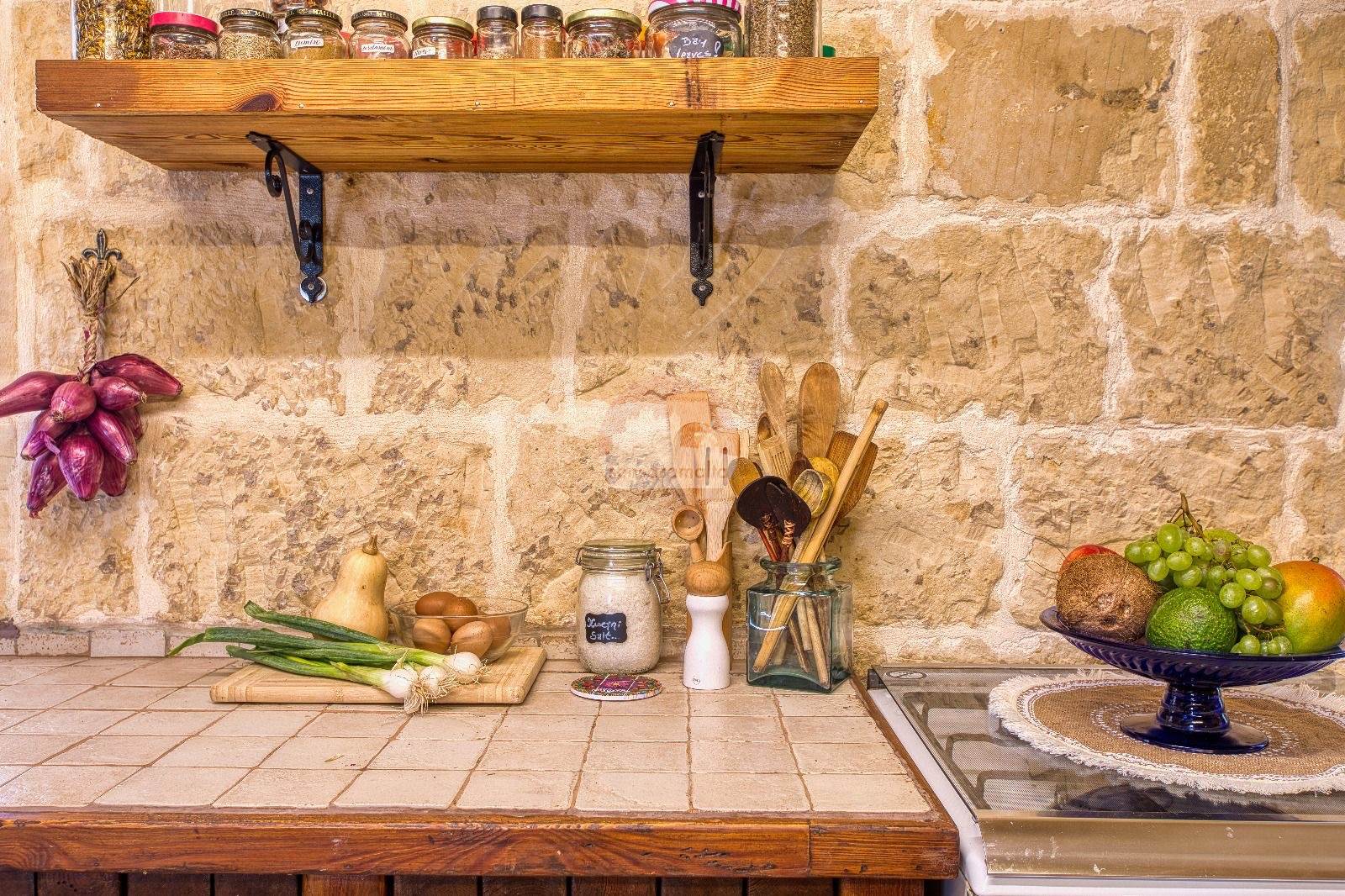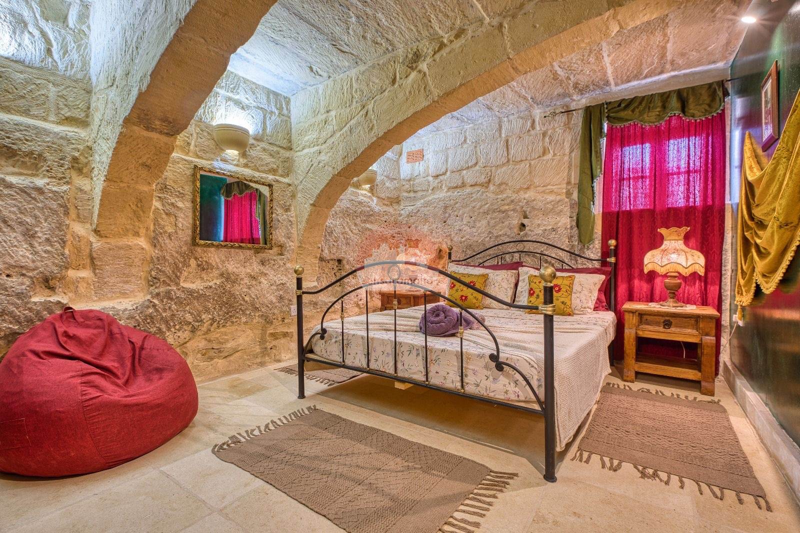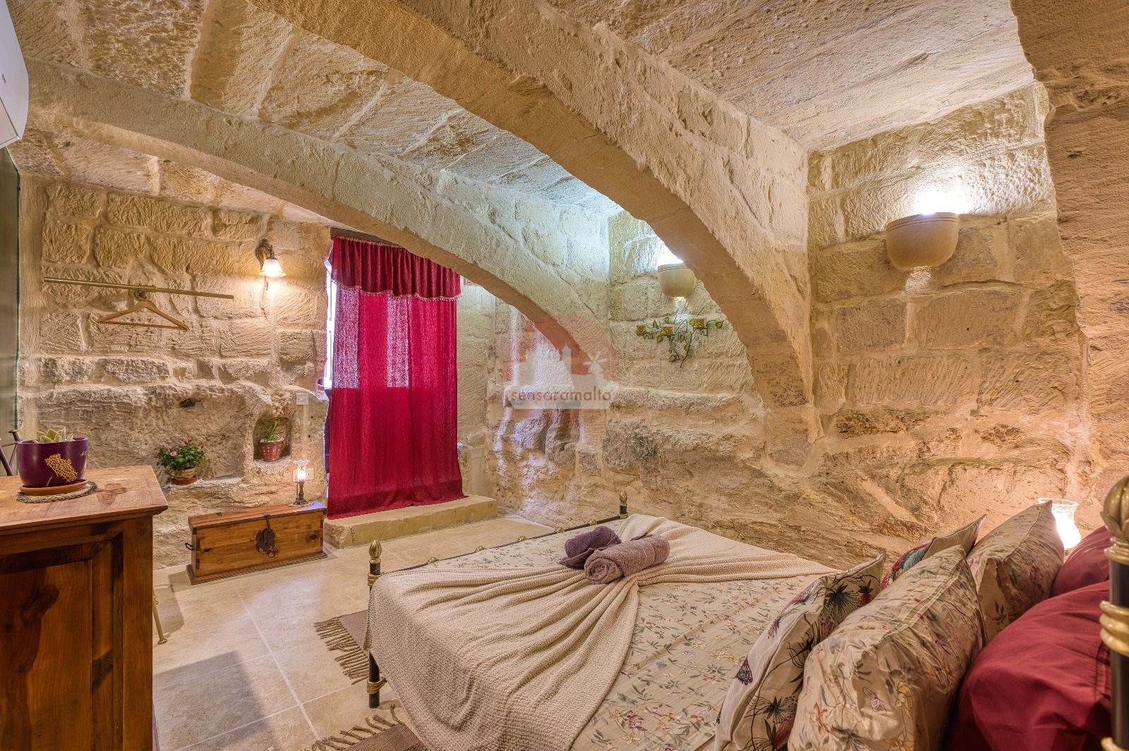 The property showcases traditional architectural features, including stone corbels, arched niches, and original stone slab ceilings and roofs.
