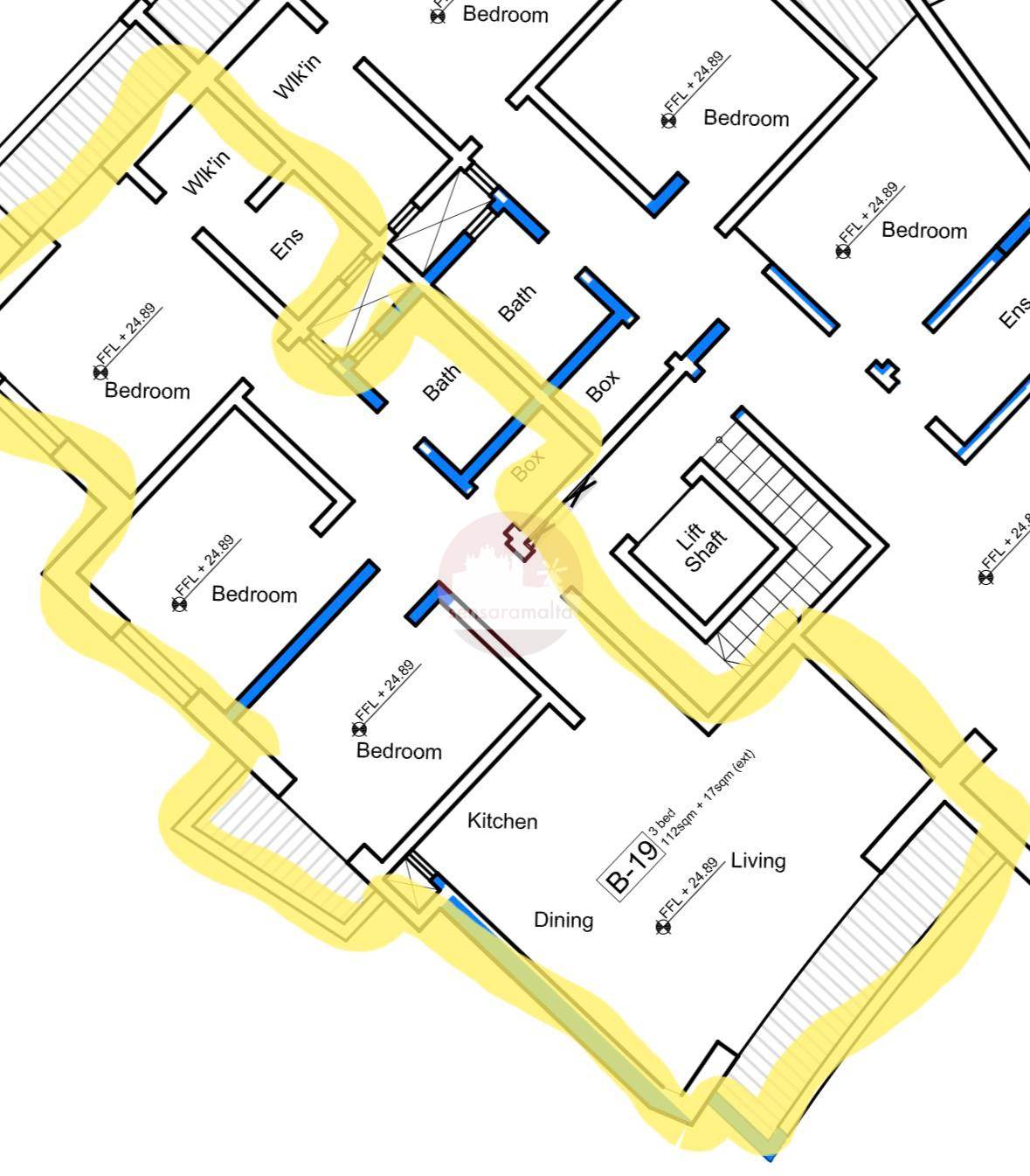 This Second floor Apartment enjoying comprises of an open plan Kitchen/Living/Dining overlooking a front balcony, a corridor leading to a laundry/box room, main bathroom, three bedrooms of which the main bedroom is served with an en-suite and walk in and back balconies.