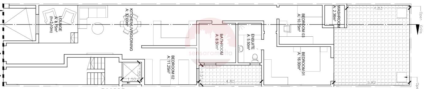 The layout comprises of an open plan kitchen/dining/living upon entrance, a large main bathroom, a washroom which is interconnected with the back yard , a large internal yard, three bedrooms and a backyard.