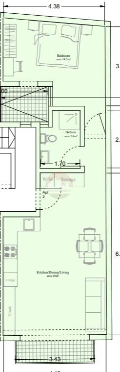 The layout consists of an open plan kitchen/dining/living with a front balcony, main bathroom and a double bedroom.