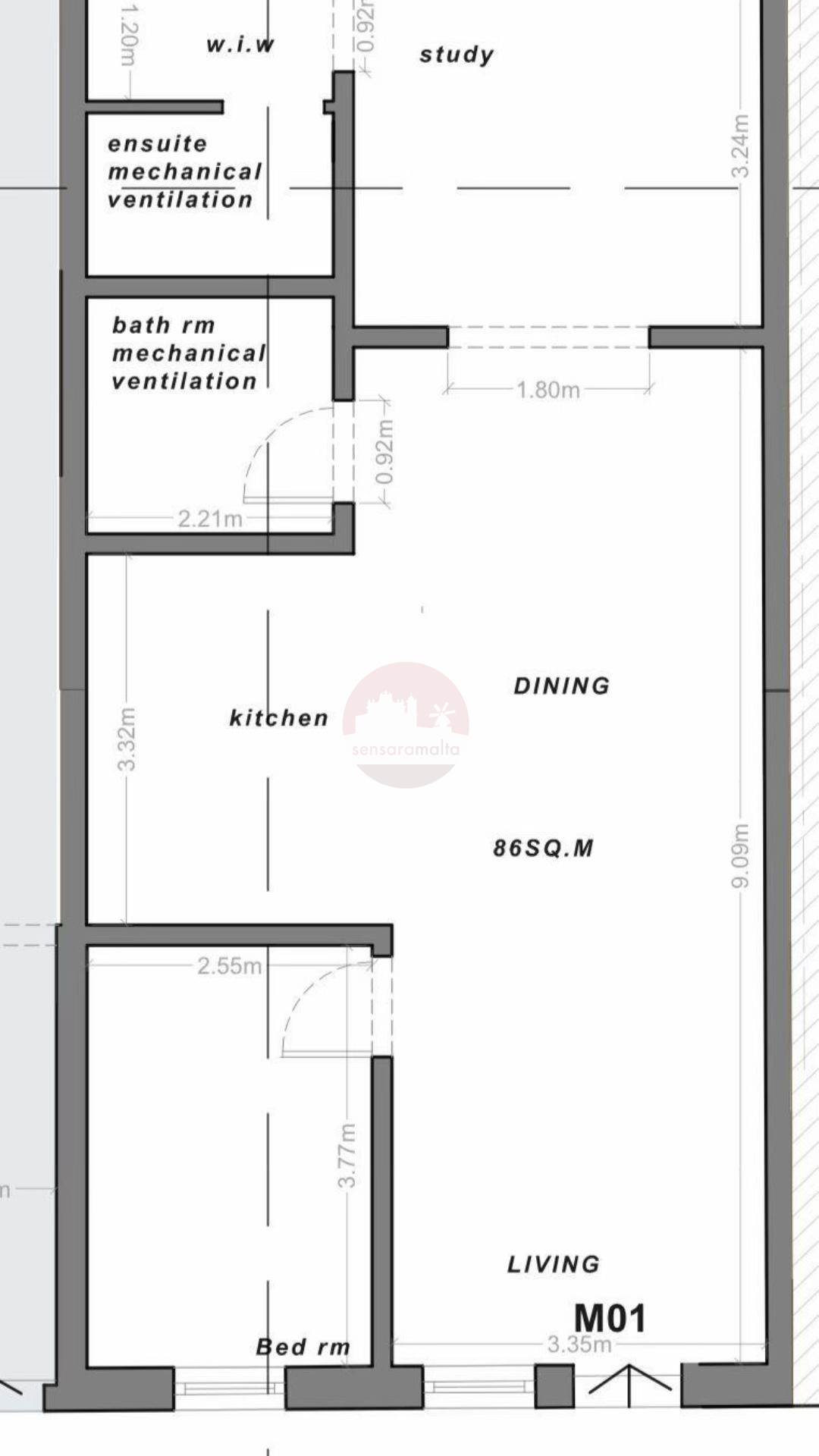 Upon entering one finds a living/dining/kitchen, bedroom, study plus ensuite, main bathroom.