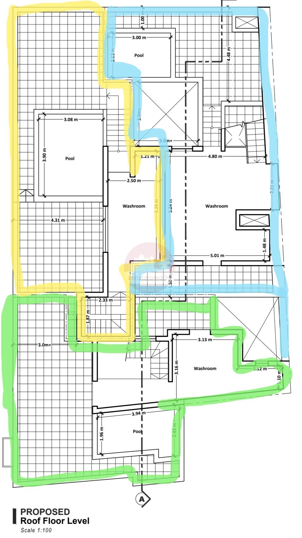 Ground floor consists of K/LD area, washroom, street level garage and and guest bathroom.First floor features 3 bedrooms, including en-suites and walk-ins wardrobe.Roof level includes a washroom and a private pool.