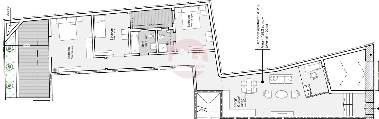 The layout comprises of an open plan kitchen/dining/living followed by a corridor, main bathroom, two double-bedrooms and a spare. The master bedroom includes an ensuite bathroom and the second double bedroom is connected to a backyard.