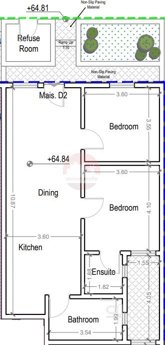 The layout comprises of a front patio, open plan kitchen/dining/living upon entering, main bathroom and two double bedrooms on the left hand side. The master bedroom includes an ensuite bathroom and is connected to an internal yard.