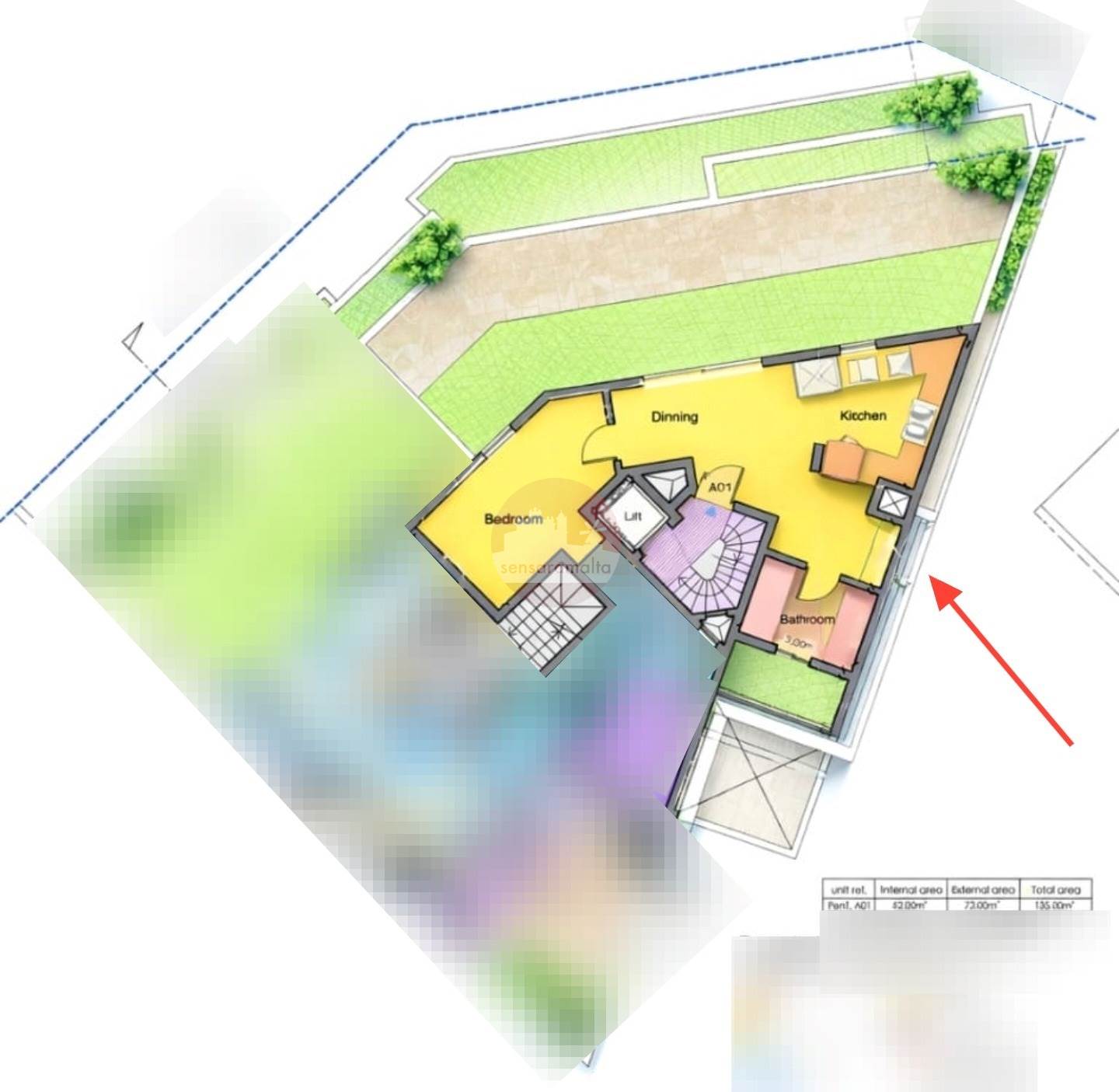 It comprises an internal space of 62 sqm, offering you a kitchen, a living and dining area overlooking a good-sized 73 sqm external terrace, and a main bathroom. Served with lift